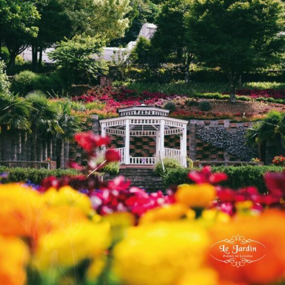 Lindo Jardim com muitas flores, loja de cosméticos e óleos essenciais com ênfase na lavanda e um Bistrô.