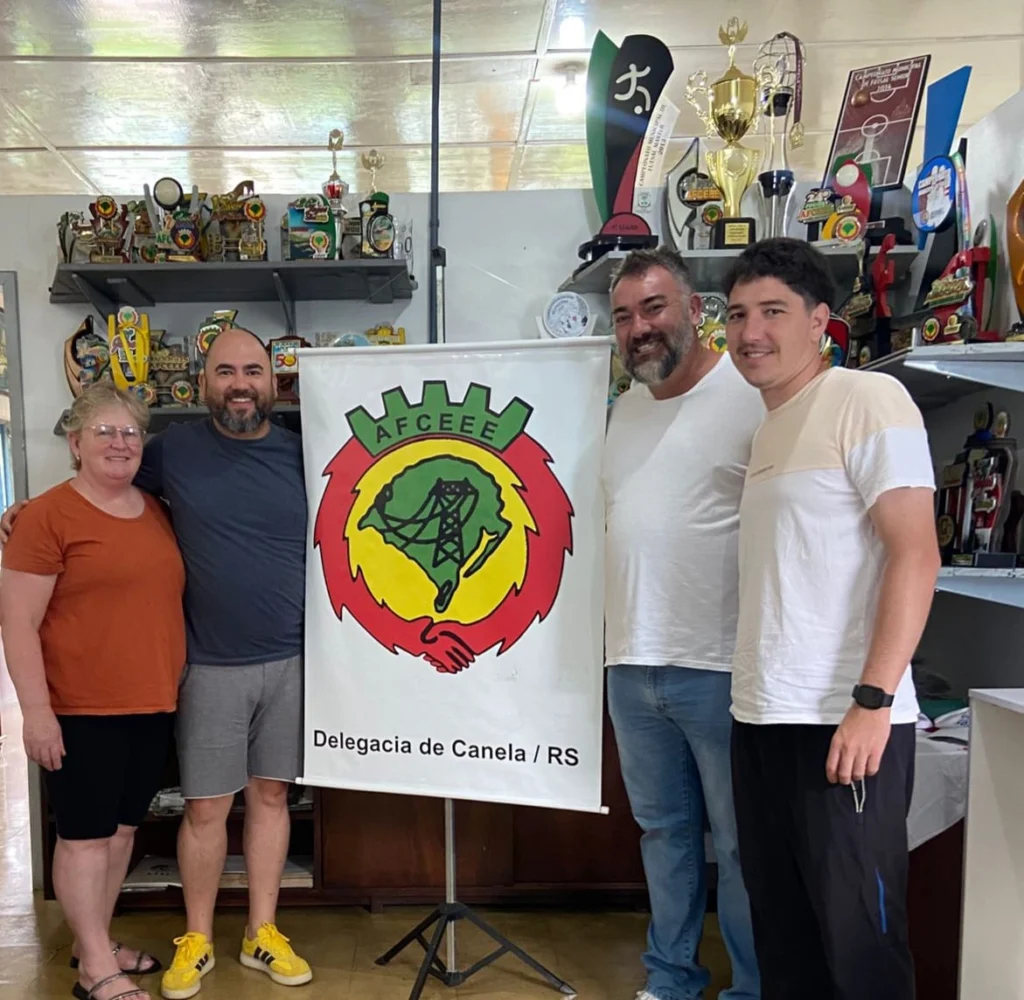 Participaram da reunião o diretor do DMEL, Marcelo Savi, o coordenador de Esportes, Roberto Gasparin, e os representantes da AFCEEE, Marcelo Rosa e Lourdes Hanauer, responsável pelo bar da entidade e também praticante da modalidade.