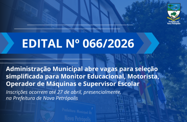 A Prefeitura de Nova Petrópolis está com inscrições abertas para Processo Seletivo Simplificado destinado à contratação emergencial e por tempo determinado para os cargos de Monitor Educacional, Motorista, Operador de Máquinas e Supervisor Escolar. As contratações são vinculadas à Secretaria Municipal de Educação e Desporto e à Secretaria Municipal de Obras e Serviços Públicos. As inscrições ocorrem até 27 de abril, exceto sábado e domingo, e devem ser feitas presencialmente no Setor de Protocolo da Prefeitura Municipal, na Rua Sete de Setembro, nº 330, 2º andar, no Centro, das 8h30 às 11h30 e das 13h30 às 16h30.
