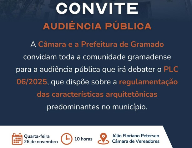 Por se tratar de uma proposta que impacta diretamente a vida dos gramadenses e de diversas empresas da construção civil e arquitetura, a Casa do Povo realizará uma audiência pública no dia 26 de novembro, às 10h, para ouvir a Prefeitura e toda a comunidade.