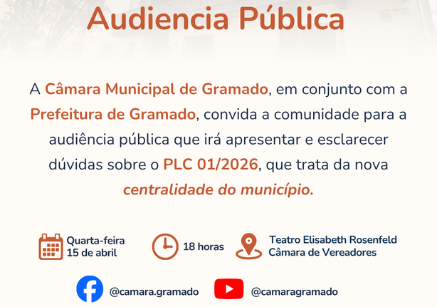 A audiência pública será realizada de forma extraordinária no dia 15 de abril, às 18h, no Teatro Elisabeth Rosenfeld, com transmissão ao vivo pelo YouTube e Facebook da Câmara Municipal de Gramado (@camaragramado).