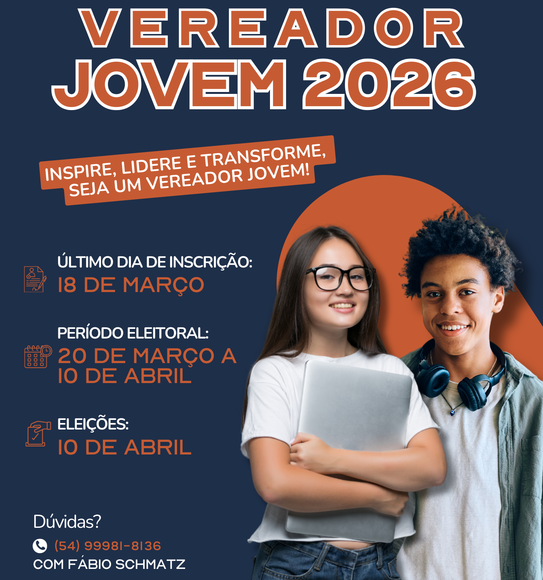A eleição do programa Vereador Jovem será realizada no dia 10 de abril, das 8h às 12h, nas dependências das escolas credenciadas, com votação por urnas eletrônicas. O resultado oficial será divulgado no mesmo dia, pelos canais institucionais da Câmara Municipal de Gramado.