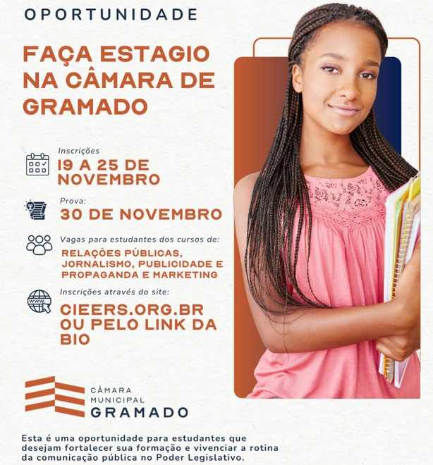 A Câmara Municipal de Gramado, por meio do Gabinete da Presidência, tornou público nesta quarta-feira (19) o processo seletivo para contratação de estagiário de nível superior. A instituição está oferecendo uma vaga, além de cadastro reserva, destinada a estudantes matriculados a partir do segundo semestre dos cursos da área de Comunicação Social, como Relações Públicas, Jornalismo, Publicidade e Propaganda e Marketing.