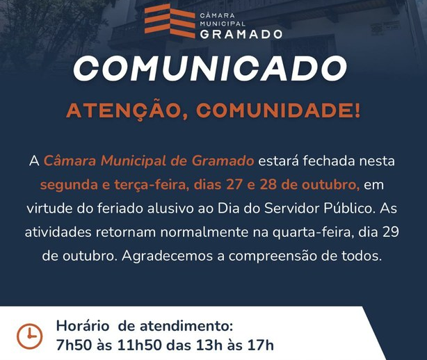 A Câmara Municipal de Gramado informa que, conforme o Decreto Legislativo nº 01/2025, que define os feriados e pontos facultativos do Legislativo gramadense, a Casa do Povo estará fechada na próxima segunda e terça-feira, em razão da comemoração do Dia do Servidor Público, celebrado em 28 de outubro.