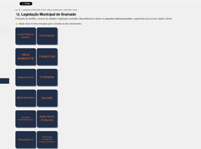Com esse olhar, o Legislativo gramadense está transformando a forma como a população acessa a legislação municipal. O site institucional foi reorganizado para oferecer uma navegação mais clara e funcional, permitindo que o cidadão encontre leis de acordo com temas do seu dia a dia.