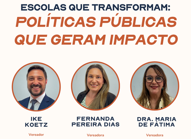 Abrindo a programação da tarde, às 14h, será realizado o Painel 1 – “Escolas que Transformam: políticas públicas que geram impacto”, que contará com a participação dos vereadores Ike Koetz, Fernanda Pereira Dias e Dra. Maria de Fátima. O momento será dedicado à apresentação do trabalho desenvolvido pela Comissão Especial Temporária do Desenvolvimento Sustentável, destacando iniciativas, diretrizes e ações voltadas à promoção de práticas sustentáveis no município. O painel também marca o lançamento do programa “Escolas que Transformam”, iniciativa que busca fortalecer políticas públicas com impacto positivo no território por meio da educação e do engajamento das instituições de ensino.