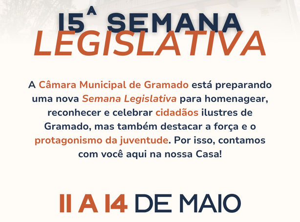 A Câmara Municipal de Gramado já está nos preparativos para mais uma edição da tradicional Semana Legislativa. Em sua 15ª edição, o evento será realizado entre os dias 11 e 14 de maio, reunindo uma programação especial voltada à valorização da comunidade, ao reconhecimento de trajetórias e ao incentivo à participação cidadã, com destaque para a juventude gramadense.