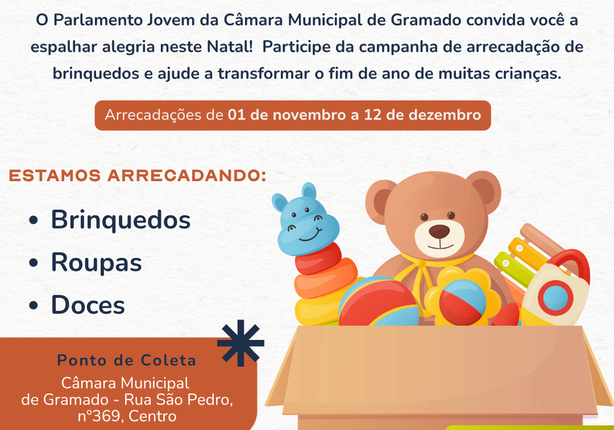 Com esse propósito, a Câmara, por meio do Parlamento Jovem, lança a campanha “Natal com Empatia – Doe Alegria, Espalhe Sorrisos”. A iniciativa acontece de 01 de novembro a 12 de dezembro, período em que a Casa do Povo estará arrecadando brinquedos, roupas e doces, que serão destinados a entidades sociais e projetos assistenciais de Gramado.