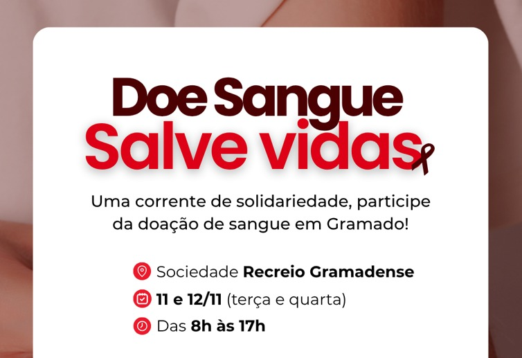 A Secretaria da Saúde de Gramado, em parceria com o Hemocentro de Caxias do Sul, convida a comunidade para participar da Campanha de Doação de Sangue, que será realizada nos dias 11 e 12 de novembro, na Sociedade Recreio Gramadense. Pela primeira vez, o município terá dois dias consecutivos de coleta, ampliando a oportunidade para que mais pessoas possam exercer esse gesto solidário. Os interessados devem agendar sua participação pelo WhatsApp (54) 99939-0167.