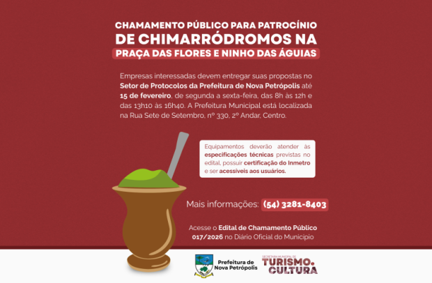 O Município de Nova Petrópolis, por meio da Secretaria Municipal de Turismo e Cultura, publicou o Edital de Chamamento Público nº 017/2026, que visa à captação de patrocínio para o fornecimento, a instalação e a manutenção de equipamentos de água potável, quente e fria, conhecidos como chimarródromos, em dois importantes atrativos turísticos do Município: a Praça das Flores e o Ninho das Águias.