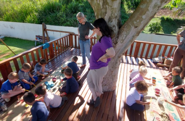 A árvore, que simboliza a marca da escola e acompanha gerações de estudantes, sempre foi ponto central do pátio e inspiração para vivências de interação e exploração. Ao seu redor, a estrutura conhecida como “casa na árvore” tornou-se, durante muitos anos, um dos locais mais procurados pelas crianças durante o brincar espontâneo. Com o tempo, porém, problemas estruturais tornaram necessário o isolamento do espaço, interrompendo o uso pelas turmas.