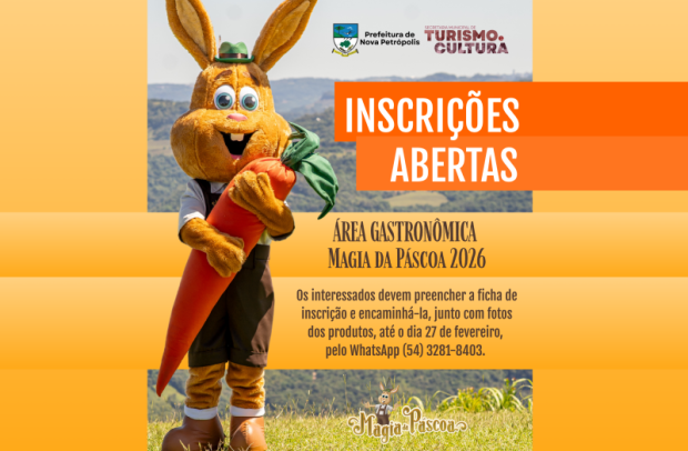 Estão abertas as inscrições para os estabelecimentos gastronômicos interessados em participar da Magia da Páscoa de Nova Petrópolis, evento que ocorre de 20 de março a 5 de abril, na Rua Coberta e Praça das Flores. Os interessados devem preencher a ficha de inscrição e encaminhá-la, junto com fotos dos produtos a serem comercializados, até o dia 27 de fevereiro, pelo WhatsApp (54) 3281-8403.