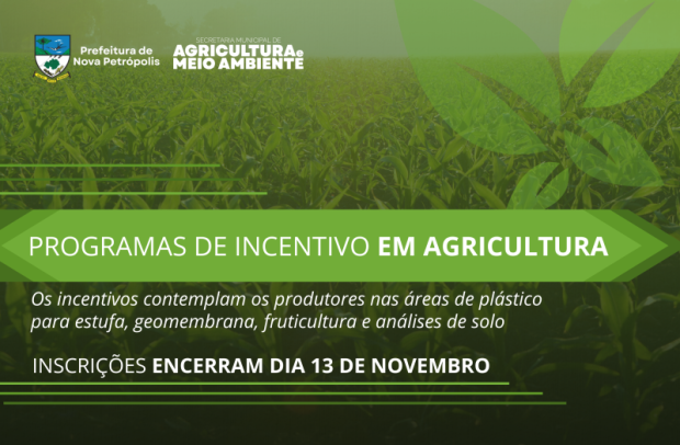 A Secretaria de Agricultura e Meio Ambiente de Nova Petrópolis comunica a abertura das inscrições para os programas de incentivo em: Plástico para Estufa; Geomembrana; Fruticultura; e Análises de Solo. As inscrições vão até o dia 13 de novembro e devem ser realizadas no setor de Agricultura e Meio Ambiente da Prefeitura Municipal de Nova Petrópolis, de segunda a sexta-feira, das 8h às 12h e das 13h30min às 16h40min. A Prefeitura Municipal está localizada na Rua Sete de Setembro, nº 330, 2º Piso, Centro. Os detalhes de cada programa podem ser consultados no Diário Oficial do Município.