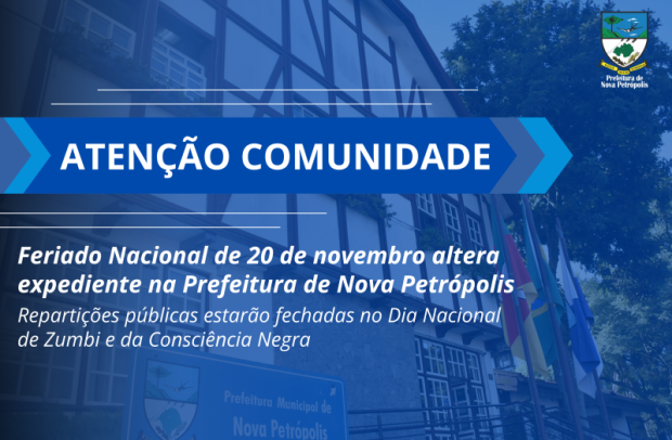 Não haverá expediente na Prefeitura de Nova Petrópolis, Secretarias Municipais e demais órgãos públicos Municipais no dia 20 de novembro, quinta-feira, conforme Lei Federal nº 14.759, de 21 de dezembro de 2023. Nesta data, comemora-se o Dia Nacional de Zumbi e da Consciência Negra e é Feriado Nacional.
