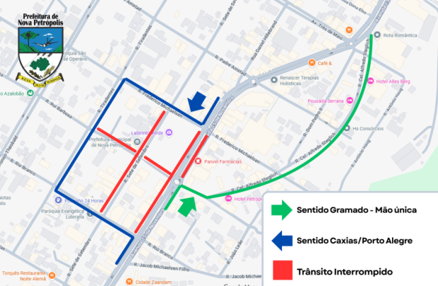 Para o deslocamento no sentido Nova Petrópolis/Gramado, o desvio será feito pela Rua Coronel Alfredo Steglich. O trânsito ocorrerá EM SENTIDO ÚNICO no trecho entre o Hotel Petrópolis e a Center Luz.
