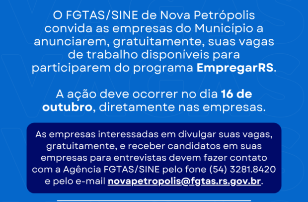 O FGTAS/SINE de Nova Petrópolis convida as empresas do Município a anunciarem, gratuitamente, suas vagas de trabalho disponíveis junto aos canais da Administração Municipal para participarem do programa EmpregarRS. A ação em Nova Petrópolis deve ocorrer no dia 16 de outubro, diretamente nas empresas.