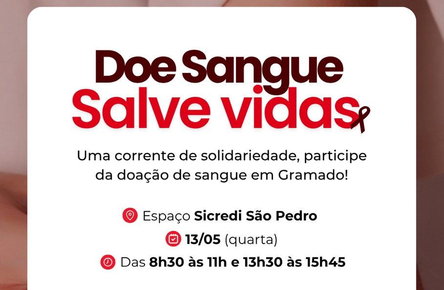 A Secretaria da Saúde de Gramado convida a comunidade para participar de mais uma campanha de doação de sangue, que acontece no dia 13 de maio. A iniciativa busca facilitar o gesto solidário, permitindo que os moradores realizem a doação diretamente no município, no Espaço Sicredi São Pedro.