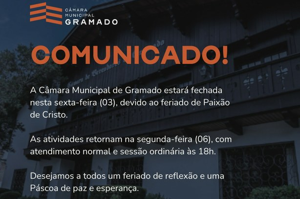 A Câmara Municipal de Gramado informa que, conforme o Decreto Legislativo nº 12/2025, em consonância com o Decreto Municipal nº 2.483/2025, o Poder Legislativo estará fechado nesta sexta-feira, dia 3 de abril, em virtude do feriado de Paixão de Cristo (Sexta-feira Santa).