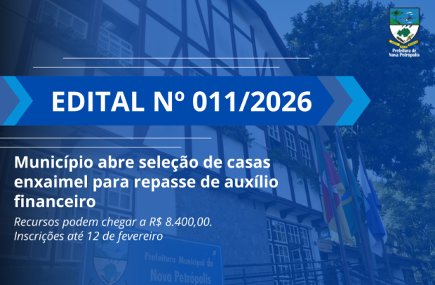 A Prefeitura de Nova Petrópolis está com inscrições abertas para o Programa Municipal de Apoio e Incentivo aos Proprietários de Imóveis Tombados, Inventariados, como os construídos em Técnica Enxaimel. Os interessados em acessar os recursos, que podem chegar a R$ 8.400,00 e serão disponibilizados às casas selecionadas, devem entregar a documentação exigida em Edital até o dia 12 de fevereiro, diretamente no Departamento de Cultura ou Arquivo Histórico Municipal. Em 2026, serão selecionadas cinco propostas.