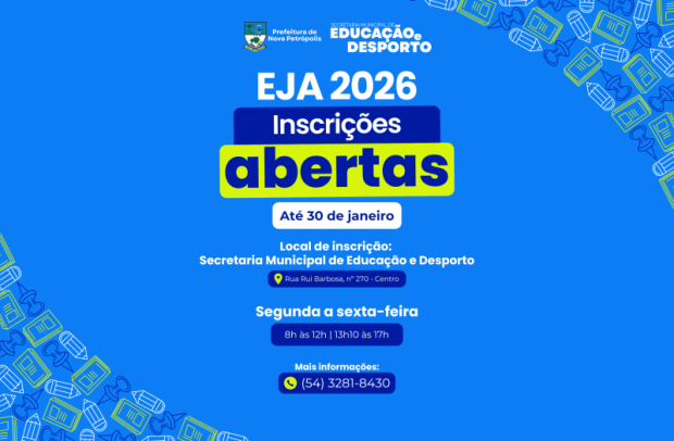 A Prefeitura de Nova Petrópolis, por meio da Secretaria Municipal de Educação e Desporto, abriu inscrições para a Educação de Jovens e Adultos (EJA), no Ensino Fundamental – Anos Iniciais e Anos Finais. Podem se inscrever jovens, adultos e idosos residentes em Nova Petrópolis, alfabetizados ou não, que, por algum motivo, não iniciaram ou não concluíram o Ensino Fundamental. Os interessados devem fazer sua inscrição até 30 de janeiro, de segunda a sexta-feira, das 8h às 12h e das 13h10 às 17h, na Secretaria Municipal de Educação e Desporto, localizada na Rua Rui Barbosa, nº 270, Centro.