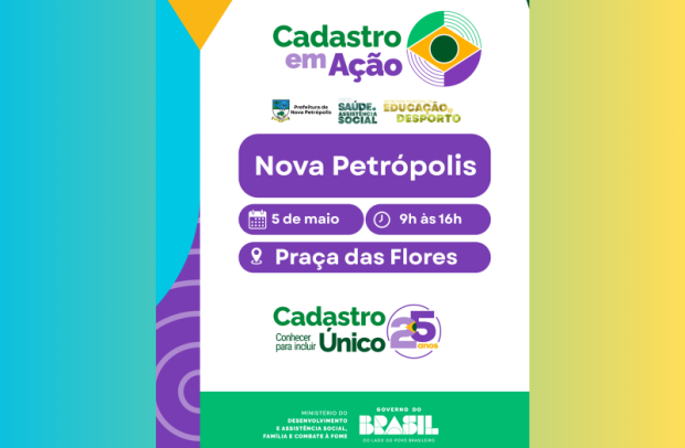 A Secretaria Municipal de Saúde e Assistência Social, em uma ação intersetorial com a Secretaria Municipal de Educação e Desporto, realiza, no dia 5 de maio, das 9h às 16h, na Praça das Flores de Nova Petrópolis, um evento em comemoração aos 25 Anos do Cadastro Único, um programa do Governo Federal que reúne informações de famílias de baixa renda e permite o acesso a serviços sociais e benefícios assistenciais.