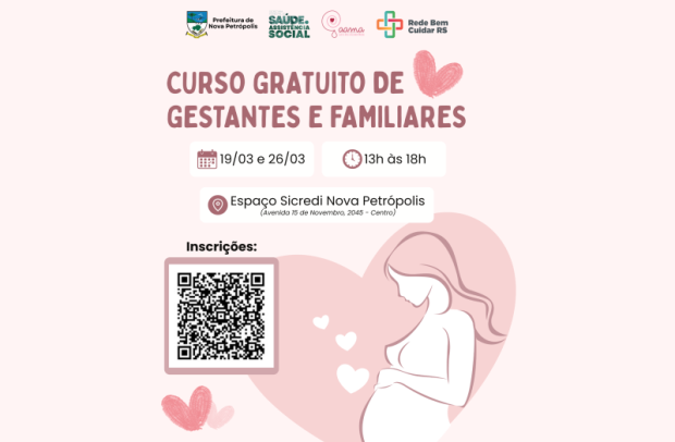 O Grupo de Apoio ao Aleitamento Materno (GAAMA) de Nova Petrópolis e a Rede Bem Cuidar do Município promovem, nos dias 19 e 26 de março, o Curso de Gestantes e Familiares, voltado à orientação, acolhimento e preparo para a chegada do bebê. A programação é totalmente gratuita e ocorre das 13h às 18h, no Espaço Sicredi, localizado na Avenida 15 de Novembro, nº 2045, Centro. As inscrições podem ser realizadas por meio de formulário online, disponível pelo link https://l1nk.dev/yS6no, ou por meio do QR Code disponível no material de divulgação. Haverá transporte gratuito, quem precisar, deve indicar a necessidade no link da inscrição.