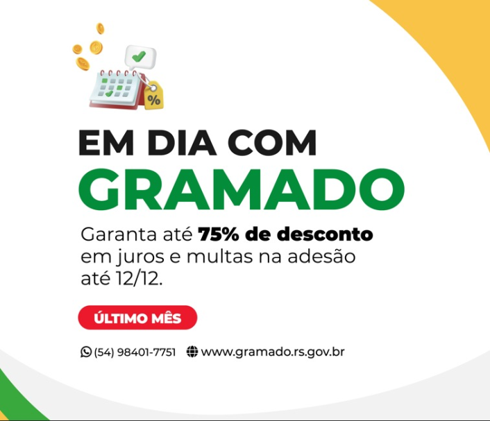 A Prefeitura de Gramado, por meio da Secretaria da Fazenda, reforça que o Programa de Recuperação Fiscal – “Em Dia com Gramado” (REFIS 2025) está em sua última fase, com prazo final de vigência até o dia 12 de dezembro. A ação oferece condições facilitadas para que contribuintes com dívidas junto ao município possam regularizar sua situação fiscal.