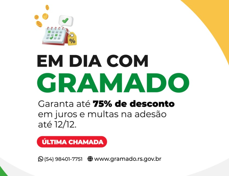 A Prefeitura de Gramado, por meio da Secretaria da Fazenda, lembra que termina nesta sexta-feira (12), o prazo para adesão ao REFIS 2025 – Programa de Recuperação Fiscal do município. Intitulada “Em dia com Gramado”, a campanha oferece condições especiais para que contribuintes, pessoas físicas ou jurídicas, regularizem seus débitos com a administração municipal.